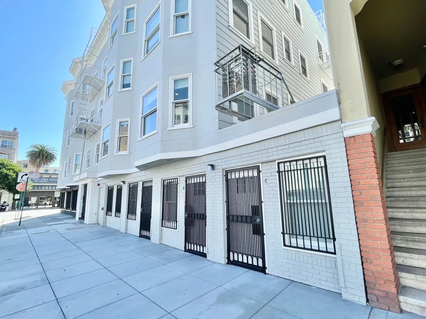 A bright, sunny street view of a white apartment building with barred doors at ground level, bay windows, and exterior staircases. A palm tree and a stop sign are visible in the background.