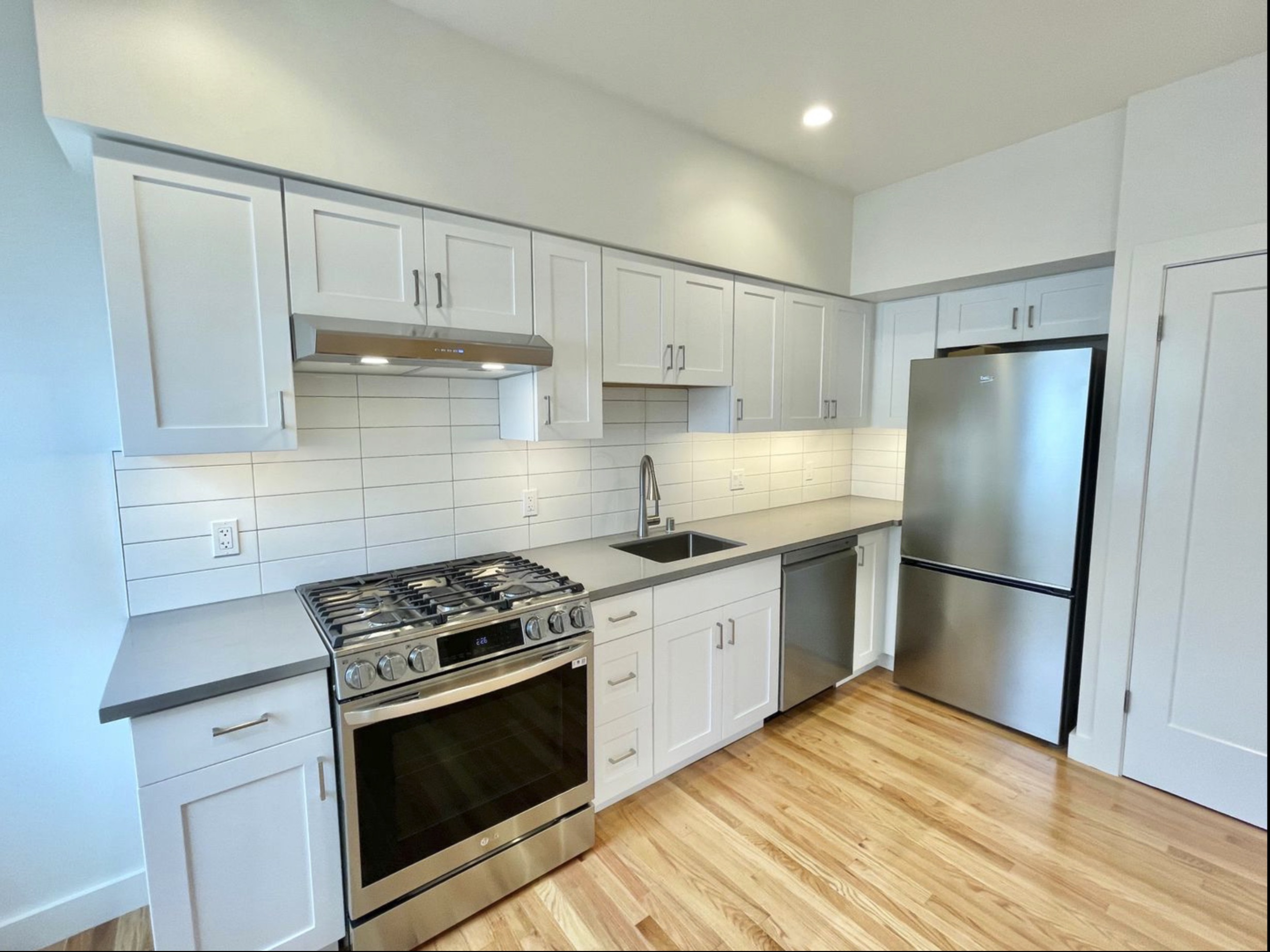 Modern kitchen with light gray cabinets, stainless steel appliances including a stove and refrigerator, white subway tile backsplash, under-cabinet lighting, and light wood flooring. The space is bright and clean.