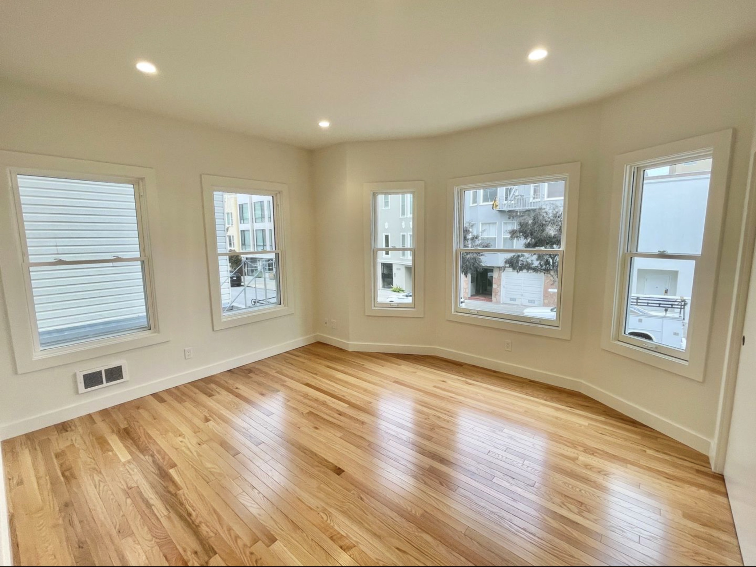 Bright empty room with light wood floors, cream-colored walls, recessed ceiling lights, and five large windows offering views of nearby buildings and a tree outside.