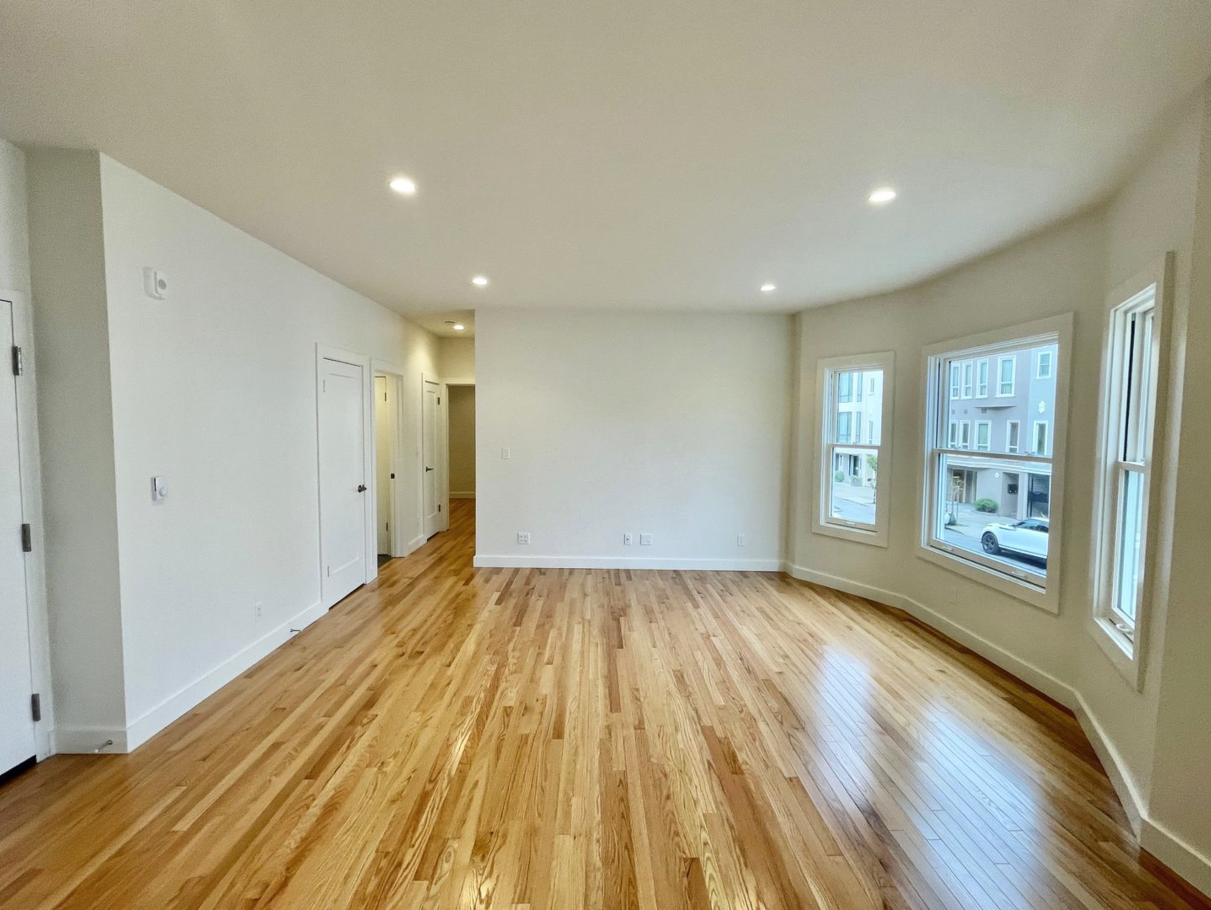 A bright, empty room with light wood floors, white walls, recessed ceiling lights, three doors on the left, and large bay windows letting in natural light from the street outside.