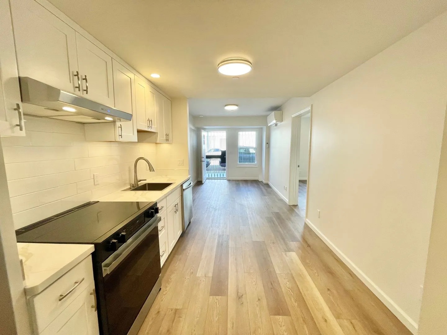 Bright, modern galley kitchen with white cabinets, stainless steel appliances, light wood flooring, and recessed lighting. The open layout leads to a living area with large windows and a door.