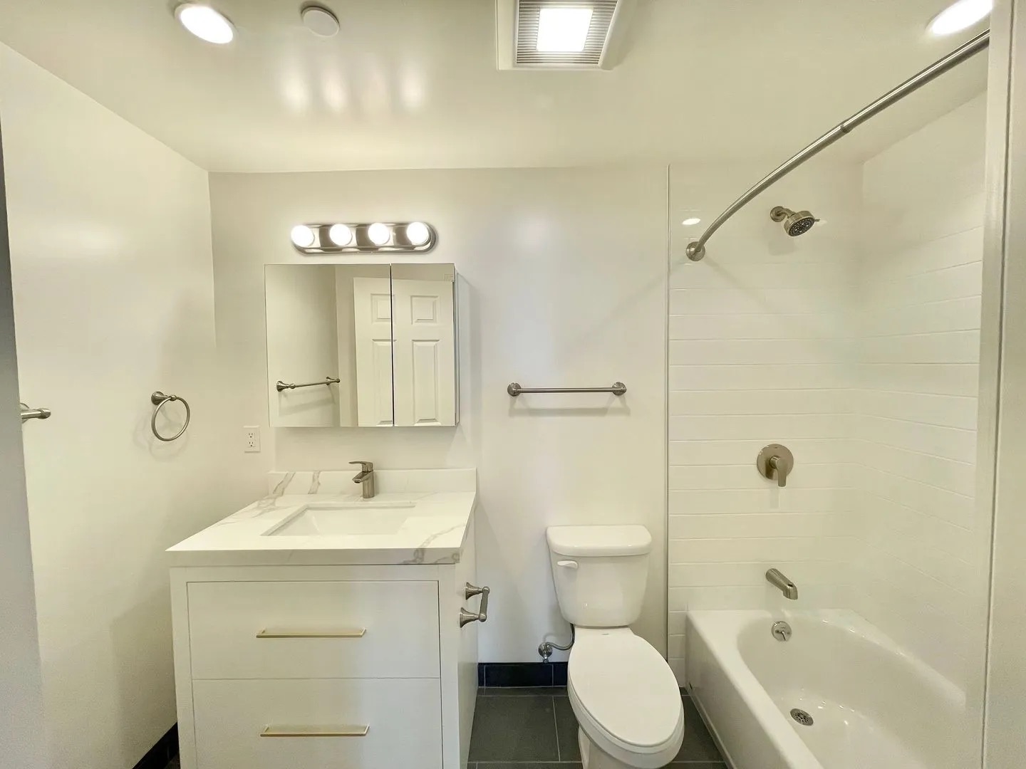 Modern bathroom with white walls, vanity with a mirror and lights, sink, toilet, chrome fixtures, towel racks, and a bathtub with a curved shower rod and tiled surround. The floor is dark and the room is well-lit.