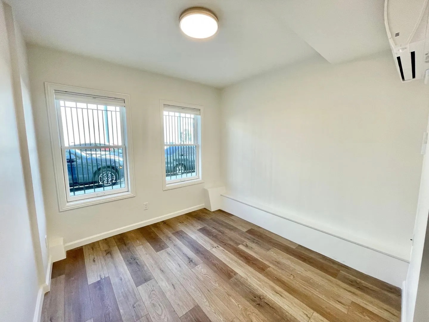 A small, empty room with light-colored walls, two windows with metal bars, wood flooring, a ceiling light, and an air conditioning unit on the wall. Parked cars are visible outside the windows.