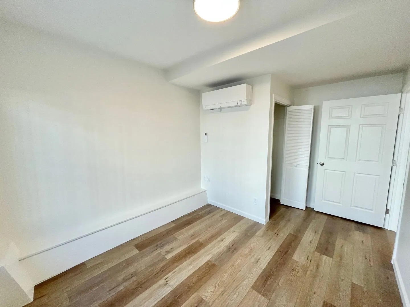 A small, unfurnished room with white walls, wood flooring, a ceiling light, a white door, a closet with a louvered door, and a wall-mounted air conditioner. The room is bright with natural light.