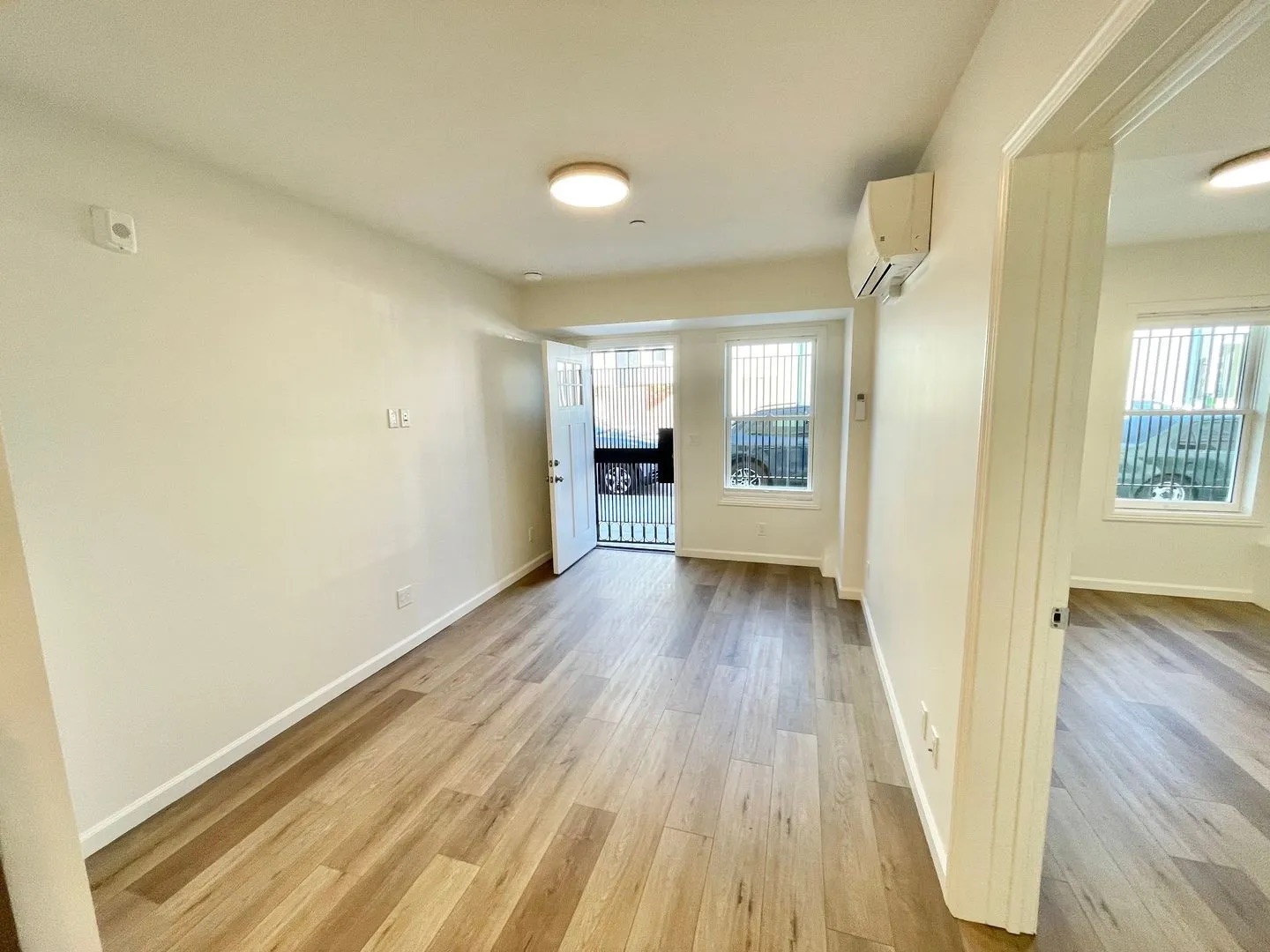 A bright, empty room with light-colored walls, wood flooring, a ceiling light, air conditioning unit, and large windows near an open door leading outside with metal security bars visible.