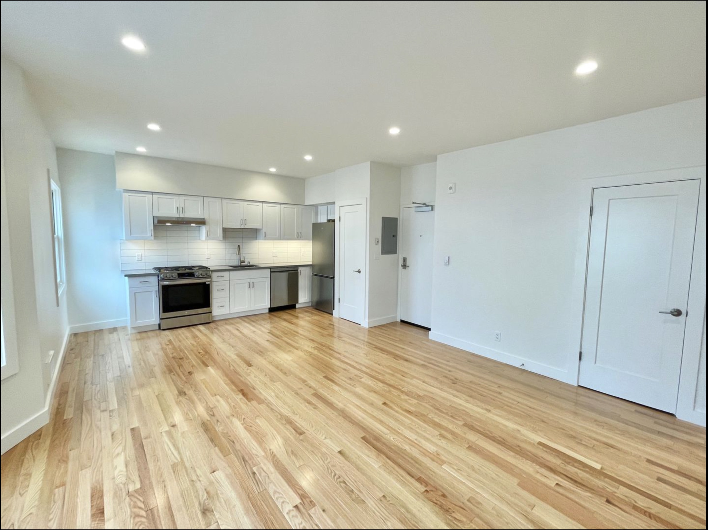 A bright, modern kitchen and living area with light wood floors, white cabinets, stainless steel appliances, and recessed lighting. White walls and multiple doors create a clean, spacious look.